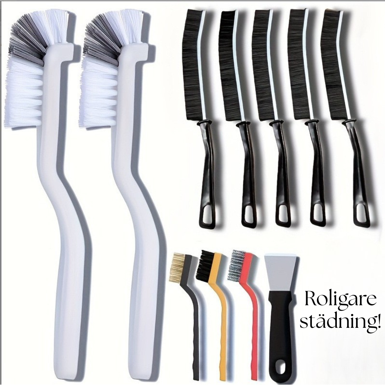 Flera olika borstar för olika typer av rengöring.